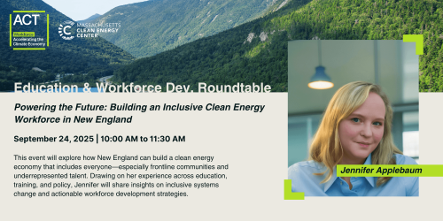 Join us for a powerful and timely session in ACT’s Education and Workforce Roundtable Series, featuring Mass Clean Energy Center's Jennifer Applebaum, a respected leader in sustainable workforce development and equitable systems design. This virtual event will explore how New England can build a clean energy economy that includes everyone—especially frontline communities and underrepresented talent.